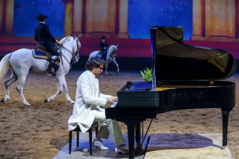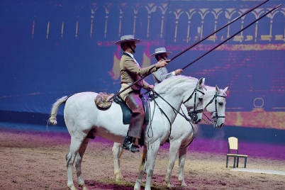 歐洲古典馬術(shù)是現(xiàn)代馬術(shù)運(yùn)動(dòng)的起源之一。在馬術(shù)秀上,來自安太谷團(tuán)隊(duì)的西班牙古典馬術(shù)表演騎手就為觀眾展示了“學(xué)院派”古典馬術(shù)表演。騎手們畢業(yè)于世界四大古典馬術(shù)學(xué)院之一的安達(dá)盧西亞皇家馬術(shù)藝術(shù)學(xué)院,他們騎乘西班牙馬種安達(dá)盧西亞馬走起舞步,身著以藍(lán)顏色為主的宮廷服飾,彰顯西班牙的傳統(tǒng)古典馬術(shù)歷史的傳承。同時(shí),西班牙著名鋼琴家馬諾洛·卡拉斯科為表演團(tuán)隊(duì)傾情伴奏。他曾任安達(dá)盧西亞皇家馬術(shù)藝術(shù)學(xué)院的音樂作曲人,為每個(gè)馬術(shù)動(dòng)作譜寫和諧動(dòng)人的鋼琴旋律。