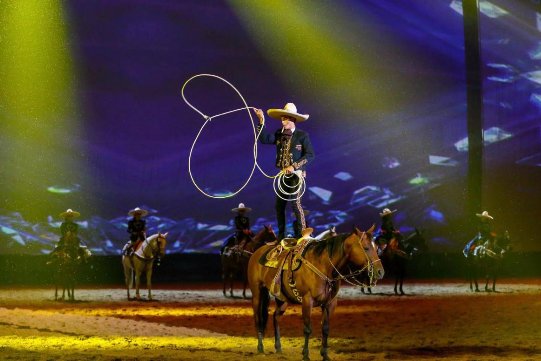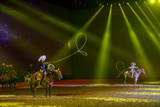 墨西哥的傳統(tǒng)騎術(shù)“Charrería沙雷里亞”屬于墨西哥中西部牛仔競(jìng)技中的一種形式,且在2016年,正式被聯(lián)合國教科文組織列入人類非物質(zhì)文化遺產(chǎn)名錄。在“世界傳統(tǒng)馴馬大會(huì)”馬術(shù)秀,墨西哥牛仔表演團(tuán)隊(duì)第一次來到中國,向中國觀眾展示墨西哥人的馬文化“活歷史”。演出中,6名墨西哥女騎手騎乘側(cè)鞍騎馬走隊(duì)形,墨西哥男性騎手手持套索,展示國民傳統(tǒng)馬背運(yùn)動(dòng)的精髓。