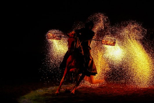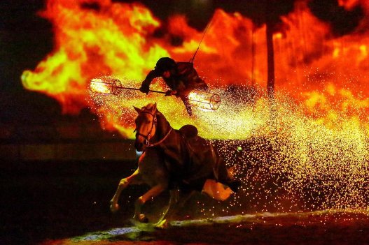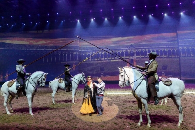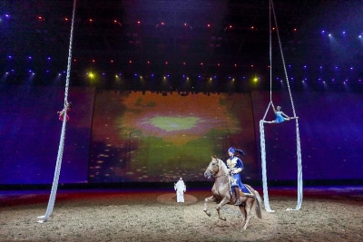 法國馬里奧團(tuán)隊(duì)的“火焰騎士”、“飛馬”和“皮埃羅夢(mèng)境”表演展現(xiàn)的就是集馬戲、舞蹈、雜技為一體的舞臺(tái)劇場(chǎng)秀。這些節(jié)目由國際著名舞馬大師馬里奧·盧拉斯基先生親自指導(dǎo),由青島德瑞馬秀從法國引進(jìn)的。其中,采用真實(shí)火焰的騎士表演帶來震撼的視覺觀感,西班牙的高級(jí)騎手乘著白色駿馬演繹一幕幕夢(mèng)幻地畫面,綢吊演出,將高空雜技與地面騎術(shù)相結(jié)合,共同演繹皮埃羅夢(mèng)境中的一段上世紀(jì)歐洲舞蹈。