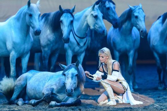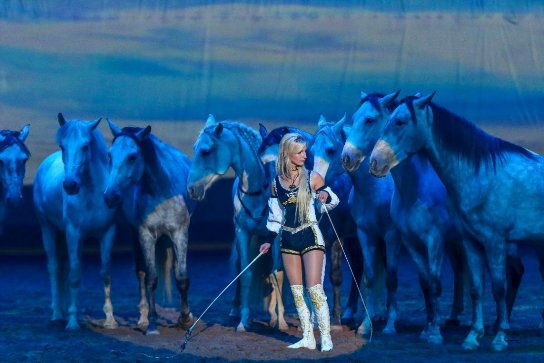 來自于烏克蘭的美女騎手安娜(Bashenko Anna)帶領(lǐng)8匹安達(dá)盧西亞馬展示自然馴馬法。充滿靈性的馬兒圍繞著一位精靈般的女孩,將“人馬合一,心意相通”的馴馬和特技表演。屏幕上呈現(xiàn)的是深藍(lán)色的海洋,唯美的音樂和背景、曼妙的身姿、溫順的馬群,浪漫的風(fēng)格是這場(chǎng)馬秀的點(diǎn)睛之筆。