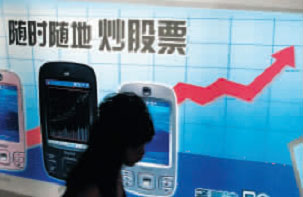 8月12日,蓮花北路一名市民從炒股手機(jī)的廣告前走過。