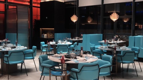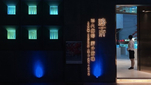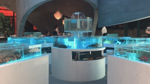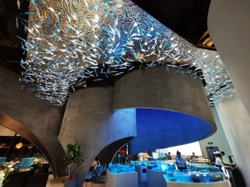 別出心裁得將海底魚(yú)群融入頂部空間,搭配藍(lán)白漸變的琉璃魚(yú)群燈。若有似無(wú)的水霧氣息環(huán)繞在海鮮池,明亮的光線(xiàn)搭配獨(dú)具海洋風(fēng)格整體裝飾,每一處細(xì)節(jié)都能讓人時(shí)刻擁抱大海的溫柔與浪漫;真正做到抬頭便是魚(yú)群嬉游,伸手變得海底珍饈。
