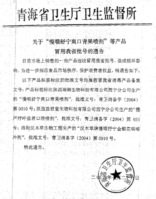 冒用桂龍產(chǎn)品批號 青海衛(wèi)生廳發(fā)通告
