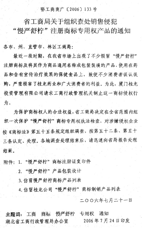 侵犯"慢嚴(yán)舒寧"商標(biāo) 湖北工商發(fā)通知
