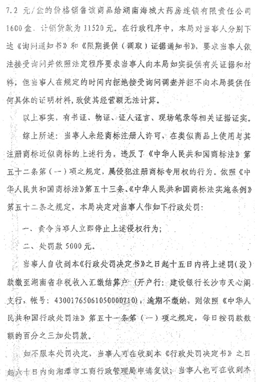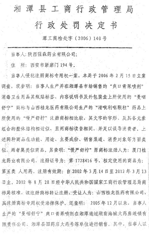 湘潭縣工商局對(duì)強(qiáng)森藥業(yè)的處罰決定書(shū)