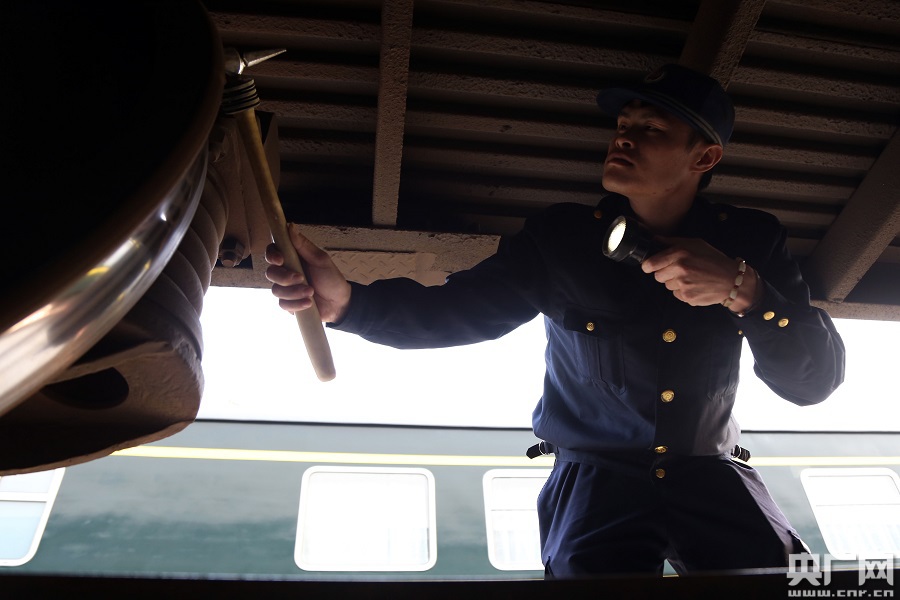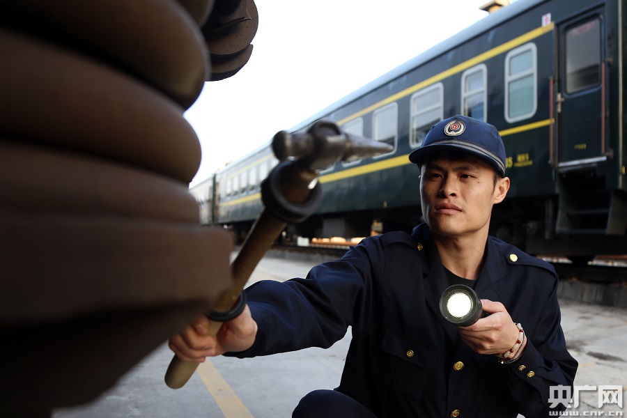 “車(chē)輛醫(yī)生”用檢車(chē)錘加強(qiáng)客車(chē)走行部檢查(央廣網(wǎng)發(fā) 王玉星 攝)