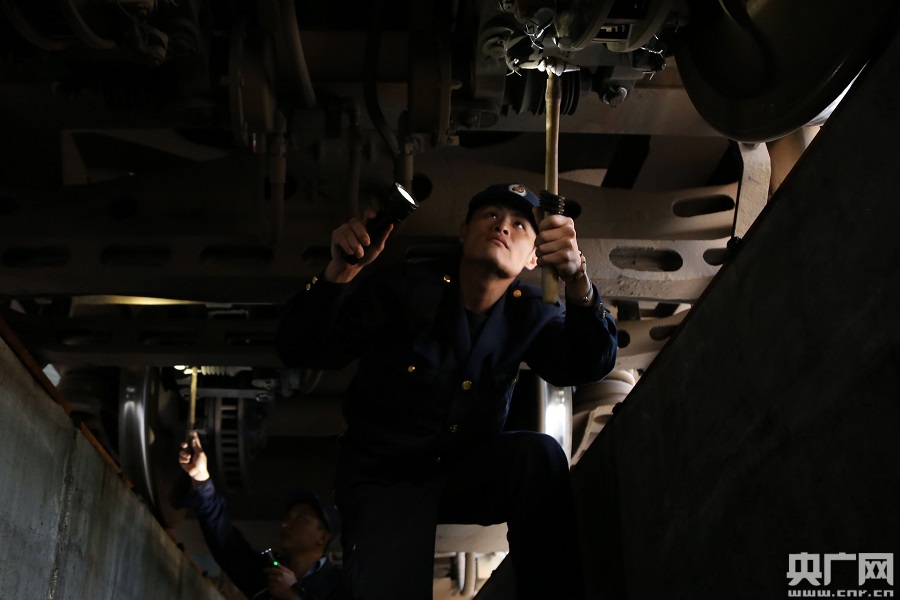 “車(chē)輛醫(yī)生”在列車(chē)底部對(duì)懸吊裝置進(jìn)行檢查(央廣網(wǎng)發(fā) 王玉星 攝)