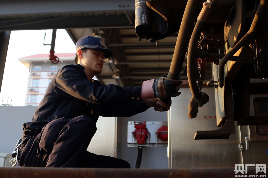 “車(chē)輛醫(yī)生”在對(duì)列車(chē)車(chē)鉤進(jìn)行檢查(央廣網(wǎng)發(fā) 王玉星 攝)