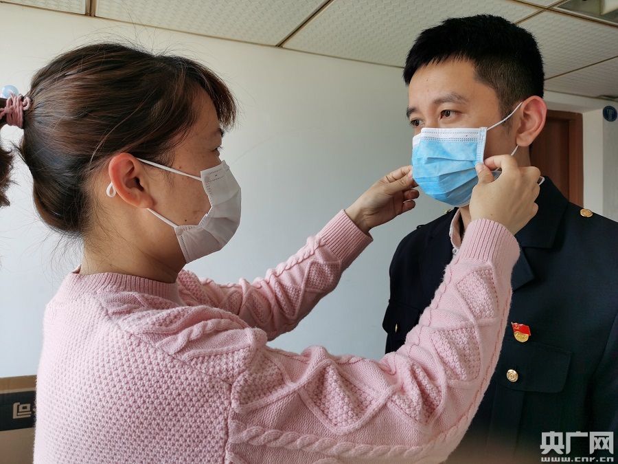 上班前,蔣琴在幫溫威戴好口罩(央廣網(wǎng)發(fā) 戴志強(qiáng)攝)