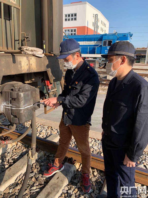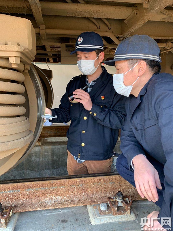 溫威對(duì)入庫客車進(jìn)行輪對(duì)狀態(tài)檢查(央廣網(wǎng)發(fā) 戴志強(qiáng)攝)