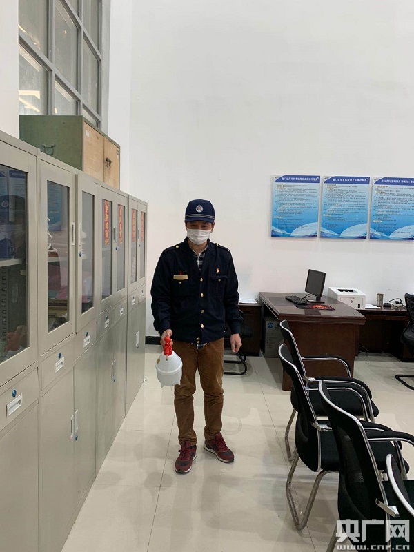 溫威正在對(duì)工班進(jìn)行消毒(央廣網(wǎng)發(fā) 戴志強(qiáng)攝)