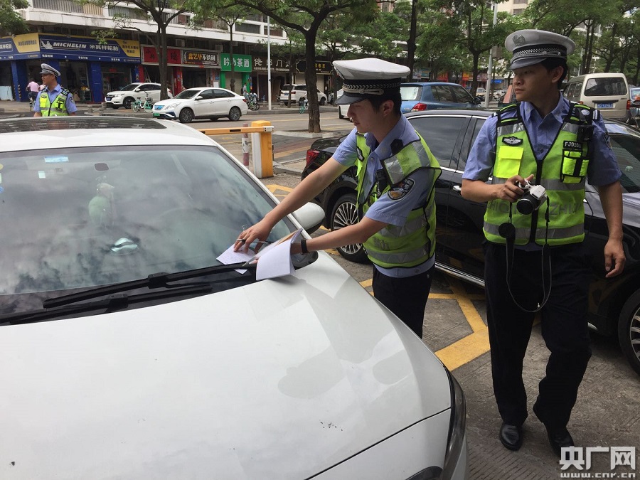 交警查處停放在消防車道上的私家車(央廣網發(fā) 通訊員供圖)