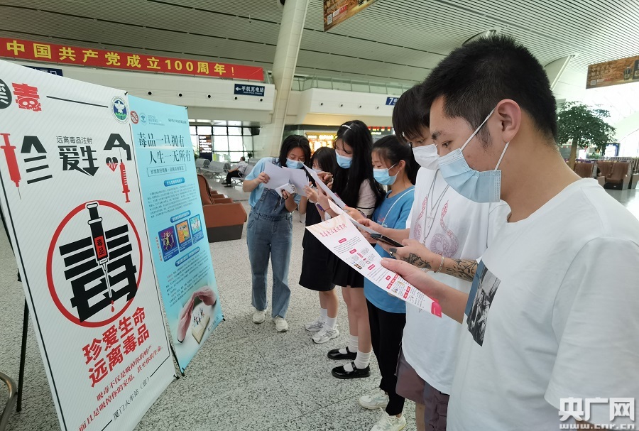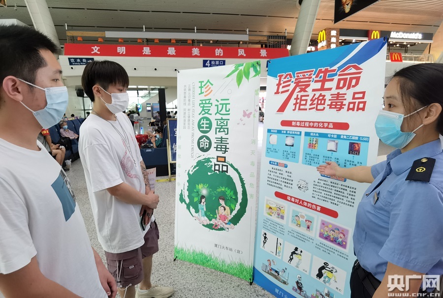 在宣傳活動中,廈門火車站以擺放宣傳展板、發(fā)放毒品警示資料、播放禁毒警示標(biāo)語等形式進(jìn)行禁毒宣傳,吸引不少旅客駐足觀看。