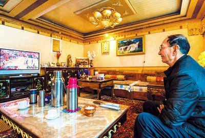 五月十七日,格桑羅布在家中看美職籃球賽。新華社記者 劉東君攝