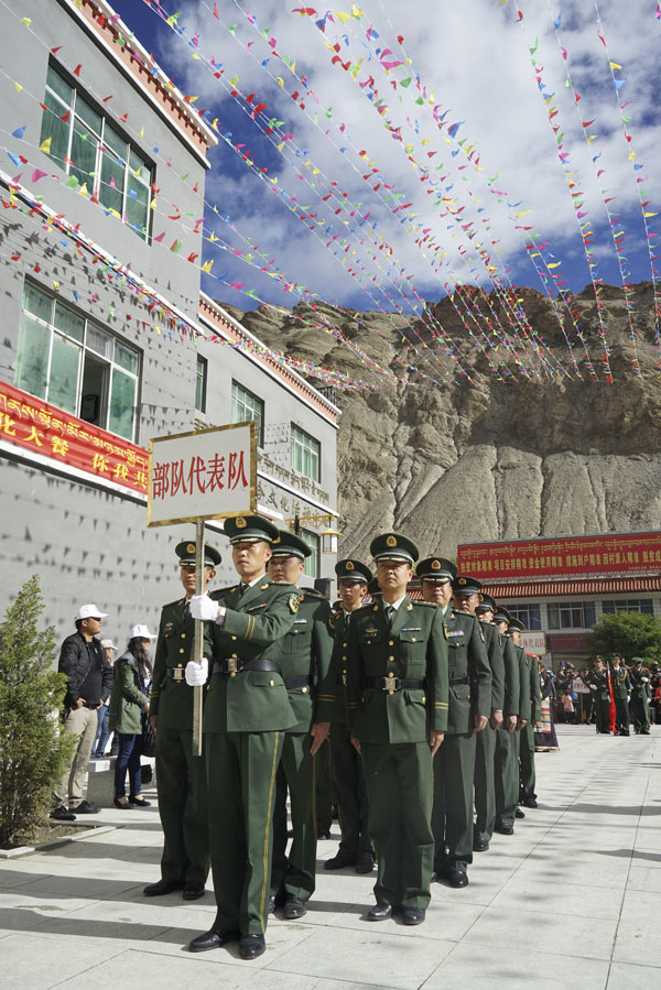 開幕式共分為五項議程。首先,來自洛扎縣各單位的8個游行方隊,共200多人,在觀眾們的歡呼喝彩聲中依次入場,順時針繞廣場一周,為開幕式預熱。其中,當?shù)伛v軍部隊的官兵步伐整齊、英姿颯爽、口號洪亮,當?shù)匕傩諢o一不歡呼鼓掌,也為這些平日里擔任祖國邊防重任的人民子弟兵送去節(jié)日的祝福。另外,僧尼方隊、藏戲表演隊、退休人員方隊、學生儀仗隊等方隊也都展示了各具特色的風采,現(xiàn)場氣氛一下子被點燃。