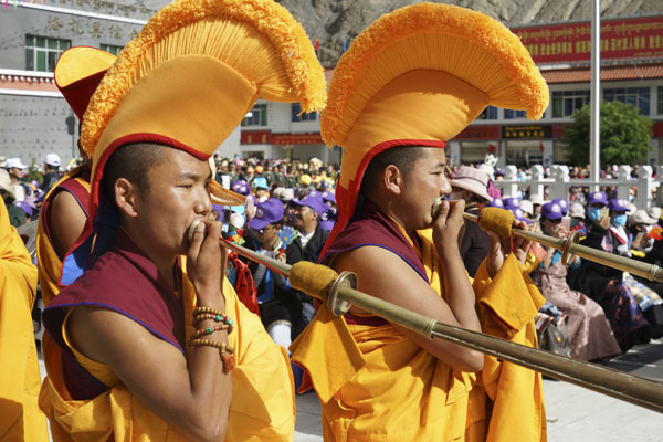 洛扎縣民間藝術(shù)團表演“頂禮舞”。