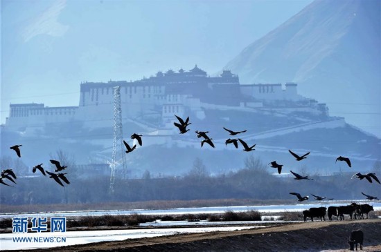 水鳥(niǎo)飛翔在拉魯濕地上空(1月7日攝)。入冬以來(lái),位于拉薩城邊的拉魯濕地國(guó)家級(jí)自然保護(hù)區(qū)候鳥(niǎo)增多,斑頭雁、赤麻鴨、野鴨等數(shù)十種候鳥(niǎo)在這里過(guò)冬。拉魯濕地國(guó)家級(jí)自然保護(hù)區(qū)海拔3600多米,總面積12.64平方公里,是中國(guó)海拔最高、面積最大的城市天然濕地,被譽(yù)為“拉薩之肺”。新華社記者 張汝鋒 攝