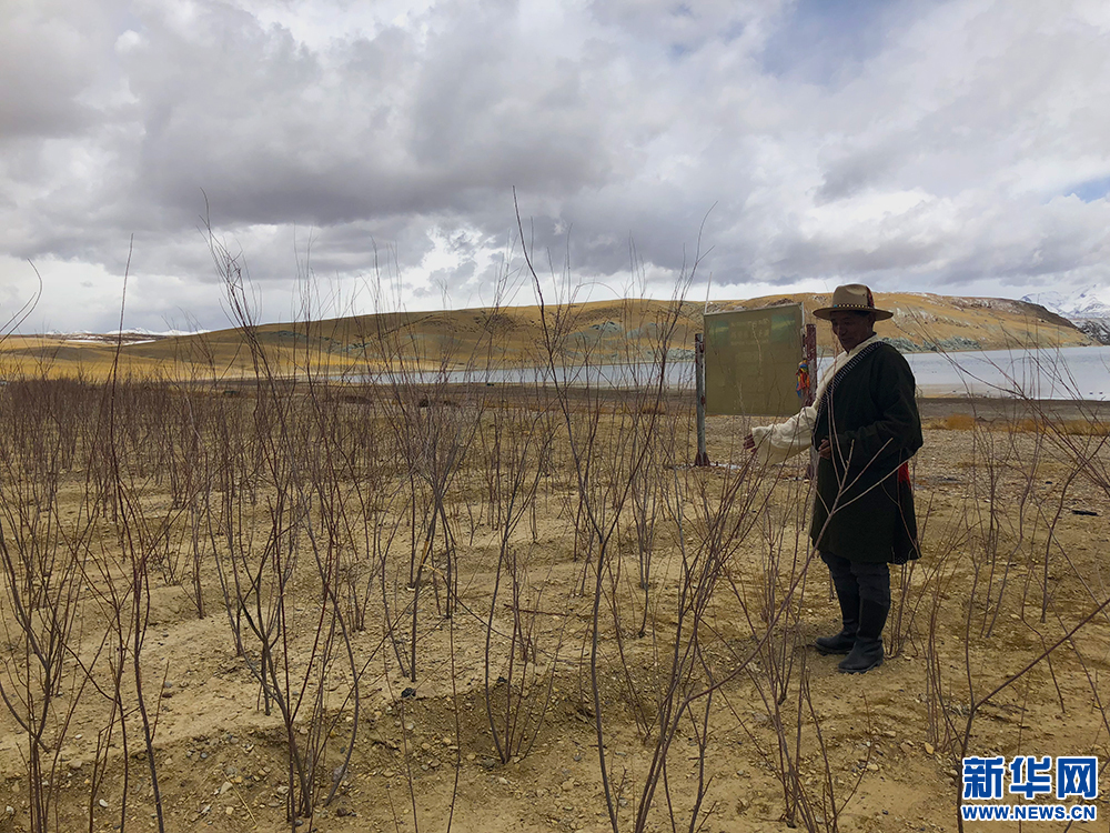 白瑪加布在查看紅柳樹(shù)苗。新華網(wǎng) 雪珍攝