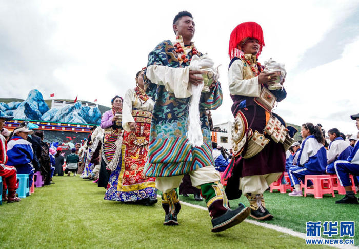 開幕式上,演員們身著芒康獨(dú)有的服飾,獻(xiàn)上甘甜的美酒,歡迎遠(yuǎn)道而來的賓朋 新華網(wǎng)張免 攝