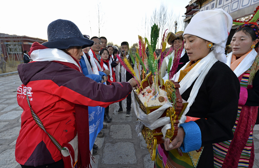 11月12日,在位于拉薩市林周縣的一個(gè)家庭旅館外,藏族群眾端著切瑪盒(五谷豐收斗),迎接前來體驗(yàn)藏家風(fēng)情的游客。 近日,由拉薩市旅游局等主辦的“冬游藏家·拉薩人家體驗(yàn)游”活動(dòng)在拉薩老城區(qū)及周邊縣鄉(xiāng)開展,為游客提供了一次體驗(yàn)雪域高原冬季獨(dú)特魅力的機(jī)會(huì)。 新華社記者 劉東君 攝