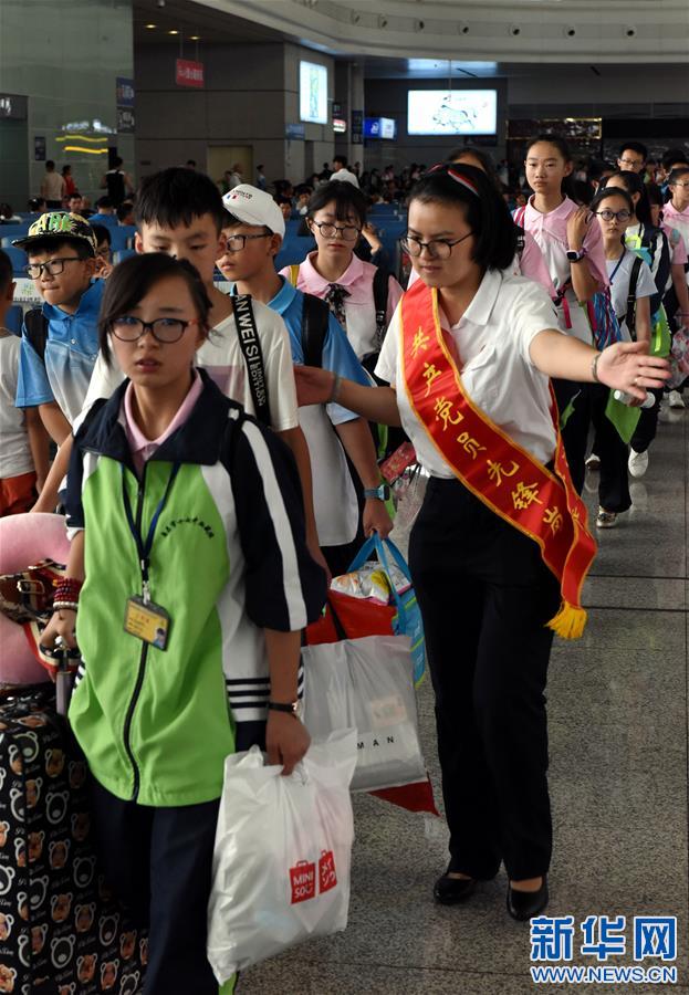 •      7月4日,南昌西站工作人員護(hù)送學(xué)生進(jìn)站上車。新華社記者 宋振平 攝