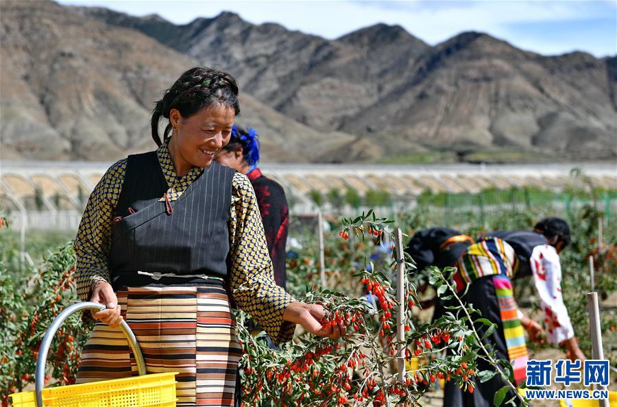 產(chǎn)業(yè)園員工那珍(左)和多吉卓瑪在采摘枸杞(9月5日攝)。新華社記者 張汝鋒 攝