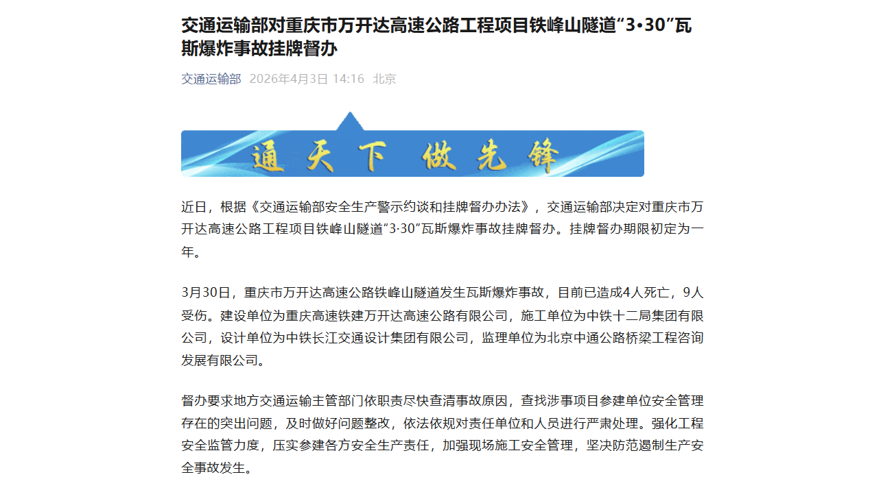 交通運(yùn)輸部決定對(duì)重慶市萬開達(dá)高速公路工程項(xiàng)目鐵峰山隧道“3·30”瓦斯爆炸事故掛牌督辦。掛牌督辦期限初定為一年。