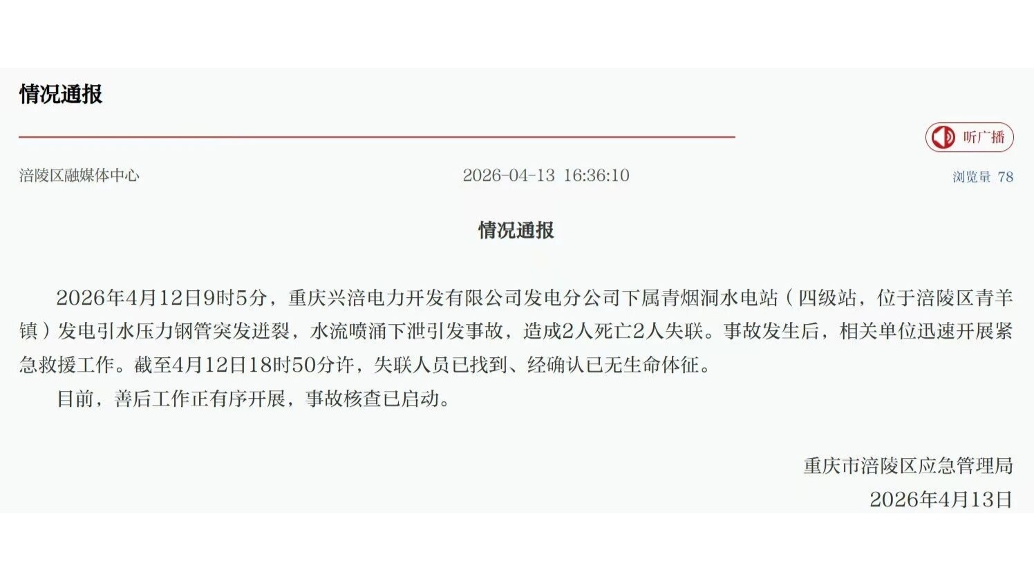 4月12日9時(shí)5分,重慶興涪電力開發(fā)有限公司發(fā)電分公司下屬青煙洞水電站發(fā)電引水壓力鋼管突發(fā)迸裂,水流噴涌下泄引發(fā)事故,造成4人死亡。