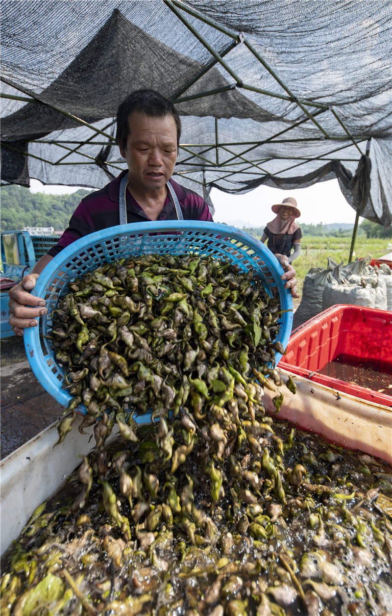 央廣網(wǎng)分宜8月5日消息(記者鄧玉玲)盛夏八月,正值菱角采收旺季,江西省新余市分宜縣鳳陽鎮(zhèn)菱角種植基地吸納60多名農(nóng)民組成的水中“淘金”團,每天可采收1.5至2萬斤菱角,通過線上線下銷售方式供應(yīng)浙江、廣東、湖北、湖南、江西等全國各地市場。