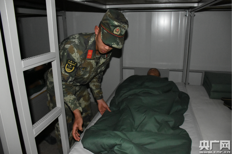 (為新兵掖被角)