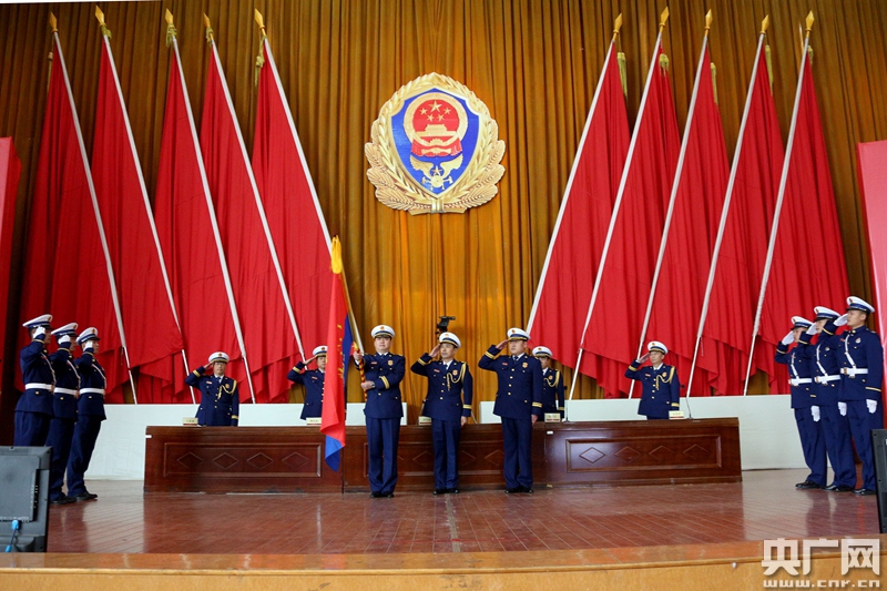 央廣網(wǎng)昆明12月31日消息(通訊員張凡兵)12月29日上午11時00分,在云南森林總隊教導(dǎo)隊室內(nèi)活動大廳內(nèi),身著“火焰藍”的云南省森林消防總隊以及所屬的昆明、保山等5個支隊單位負責(zé)人先后從該總隊總隊長齊興彬手里接過紅藍相接的中國消防救援旗,隨著接旗人立定、持旗完畢,在嘹亮的“敬禮”聲中,佩戴嶄新標志服飾的森林消防指戰(zhàn)員向隊旗莊嚴敬禮。