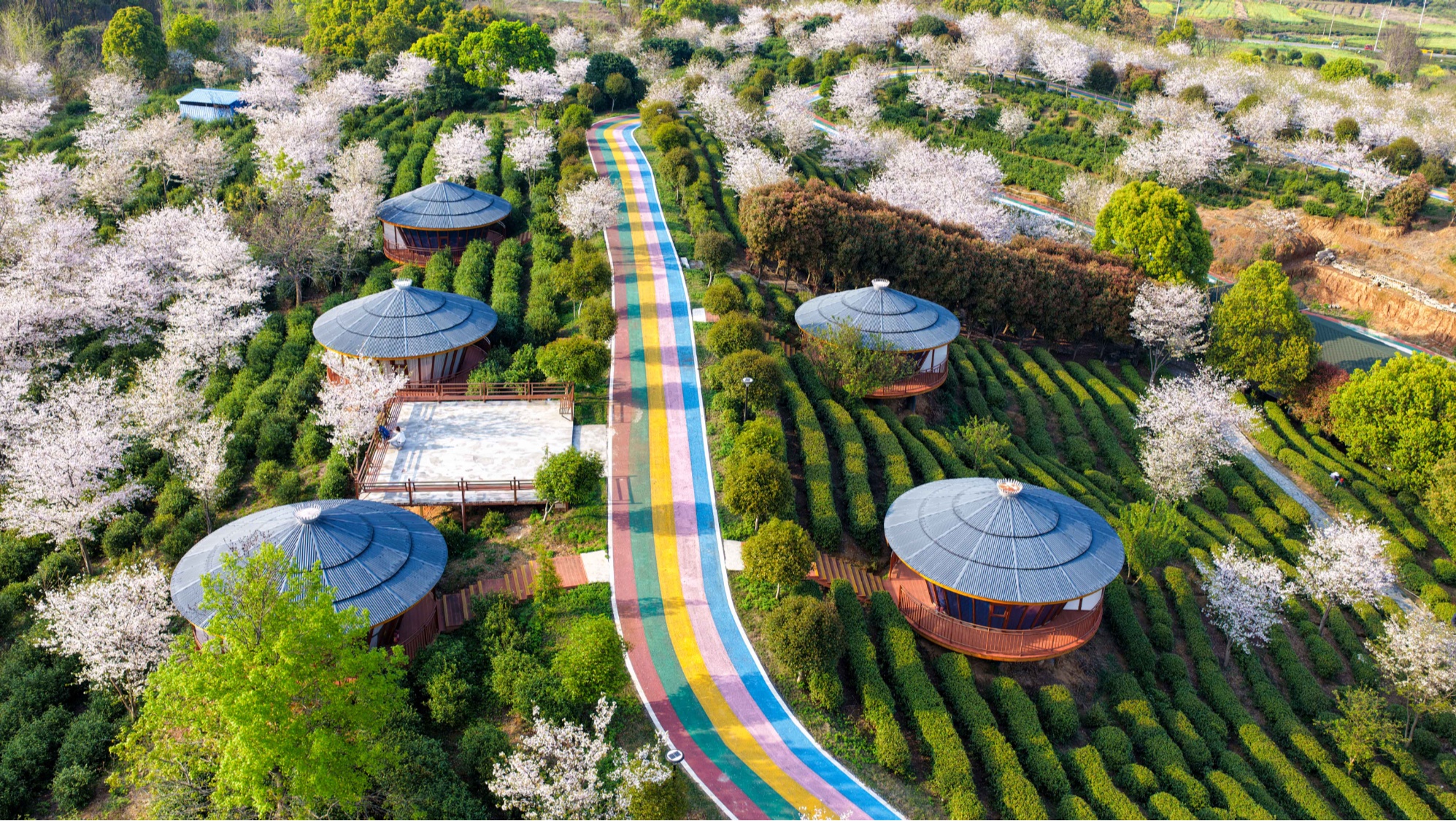 江西九江廬山市海廬茶博園內(nèi)櫻花爛漫、春色滿園。
