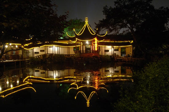 網(wǎng)師園,是蘇州中型古典山水宅園的代表作品。網(wǎng)師園布局精巧,結(jié)構(gòu)緊湊,以建筑精巧和空間尺度比例協(xié)調(diào)而著稱。園分三部分,境界各異。東部為住宅,中部為主園。網(wǎng)師園按石質(zhì)分區(qū)使用,主園池區(qū)用黃石,其他庭用湖石,不相混雜。突出以水為中心,環(huán)池亭閣也山水錯(cuò)落映襯,疏朗雅適,廊廡回環(huán),移步換景,詩意天成。古樹花卉也以古、奇、雅、色、香、姿見著,并與建筑、山池相映成趣,構(gòu)成主園的閉合式水院。池水清澈,東、南、北方向的射鴨廊、濯纓水閣、月到風(fēng)來亭及看松讀畫軒、竹外一枝軒。集中了春、夏、秋、冬四季景物及朝、午、夕、晚一日中的景色變化。所以游園時(shí),宜坐、宜留、以靜觀為主。繞池一周,可前細(xì)數(shù)游魚,可亭中待月迎風(fēng)。花影移墻,峰巒當(dāng)窗,宛如天然圖畫,所以并不覺其園小。夜游網(wǎng)師園除了能品味園林夜景,還能欣賞到評(píng)彈、昆曲等節(jié)目。