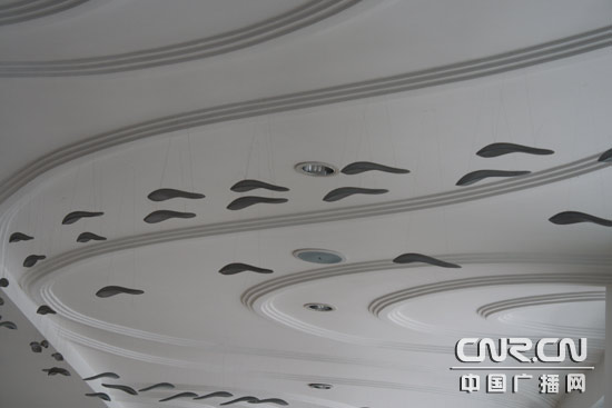 配合水的主題,教學(xué)樓頂上滿(mǎn)是游魚(yú)的掛飾。(中廣網(wǎng)記者李玲燕 攝)