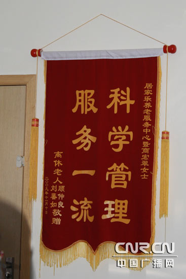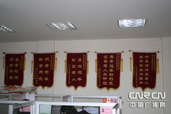滿含感激的錦旗掛滿“鄰里情虛擬養(yǎng)老院”。(中廣網(wǎng)記者李玲燕 攝)