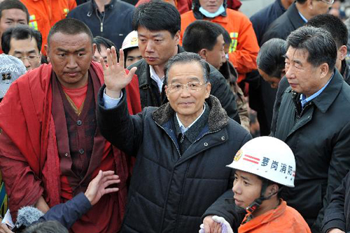 溫家寶在青海省玉樹縣結(jié)古鎮(zhèn)看望慰問災(zāi)區(qū)群眾