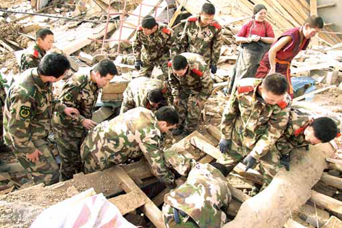 中廣網(wǎng)北京4月16日消息 蘭州軍區(qū)救援官兵已經(jīng)救出100余人,記者記錄了他們奮戰(zhàn)40多分鐘從廢墟下救出一對母女的全過程。