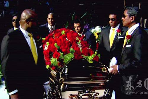 斯臺(tái)普斯體育中心內(nèi)的舞臺(tái)周圍布滿鮮花,悼念儀式開(kāi)始之前,全場(chǎng)觀眾起立,等待著杰克遜的靈柩到場(chǎng)。杰克遜的家人們護(hù)送著靈柩繞場(chǎng)一圈,然后停在舞臺(tái)正前方。歌迷們齊聲呼喊邁克爾-杰克遜的名字,表達(dá)著對(duì)這位流行音樂(lè)之王的不舍之情。