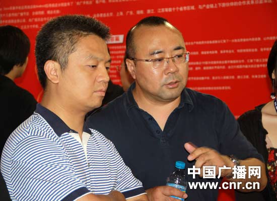 中央人民廣播電臺副臺長王曉暉在央廣新媒體文化傳媒(北京)有限公司總裁李濤的陪同下視察中央臺展位。