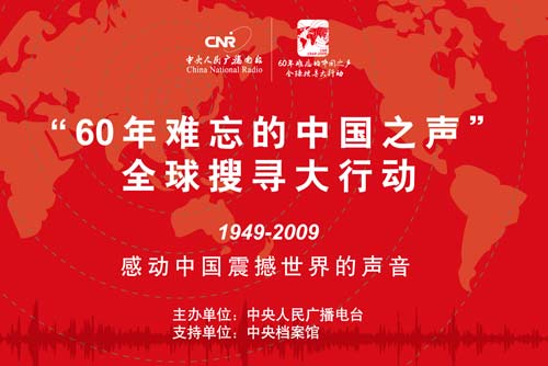 4月28日,人民大會(huì)堂湖北廳內(nèi),隨著印有“六十年難忘的中國(guó)之聲”全球搜尋大行動(dòng)標(biāo)志的多米諾骨牌成功倒下,由中央人民廣播電臺(tái)發(fā)起的“六十年難忘的中國(guó)之聲”全球搜尋大行動(dòng)正式啟動(dòng)。中央人民廣播電臺(tái)中國(guó)之聲、中國(guó)廣播網(wǎng)對(duì)此次活動(dòng)進(jìn)行全程直播。