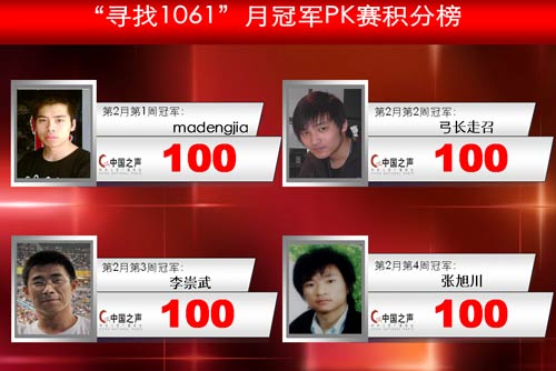 “尋找1061”第二個月冠軍在5月26日22:00的《1061第二個月冠軍PK賽》中誕生。四位周冠軍張旭川、李崇武、張超、小馬激戰(zhàn)1小時30分,最后,來自四川的張旭川勝出。中國之聲、中國廣播網進行了全程音視頻直播。首先讓我們一睹四位周冠軍的個性亮相吧。