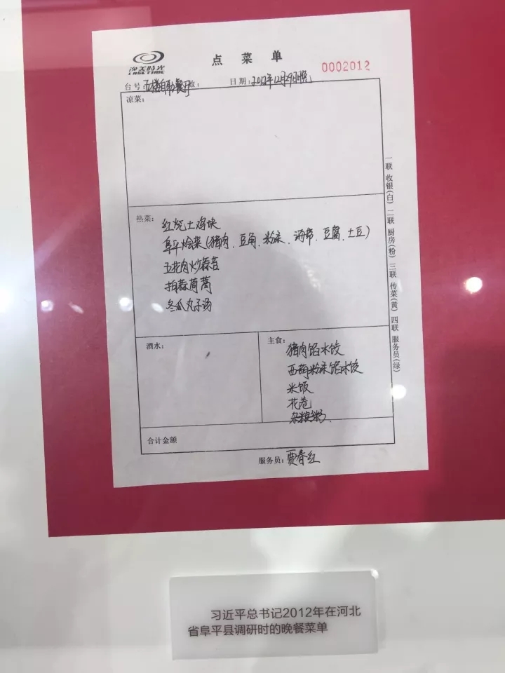 講解員:現(xiàn)在我們在的是第十展區(qū)的第六單元,可以說這一單元幾乎就是用數(shù)字來說話。我們來看,這是一份菜單和伙食費單據(jù),這是習近平總書記2012年12月在阜平縣調(diào)研時的晚餐菜單,從餐食上看我們可以知道這份飯菜比較簡單,2012年12月29日至30日,習近平總書記在河北省阜平縣看望慰問困難群眾,住的是縣招待所的普通房間,吃的是農(nóng)家大盆菜,看的是最窮的地方。