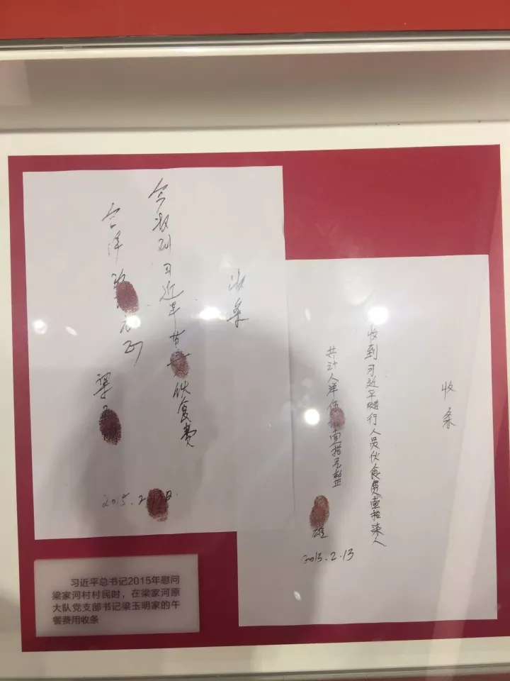 講解員:這張160元的伙食費單據(jù),是2014年3月,習近平總書記來到河南省蘭考縣調(diào)研時,在焦裕祿干部學院交納的伙食費;這張收條,是2015年春節(jié)前夕,習近平總書記回到闊別已久的陜西省延安市延川縣梁家河村看望鄉(xiāng)親們時,在梁家河原大隊黨支部書記梁玉明家的午餐費用收條。在當年的老支書,也是習近平入黨介紹人梁玉明家,主人熱情邀請習近平總書記留下吃頓便飯。熱氣騰騰的燉羊肉、蕎麥饸饹、油饃饃、蒸南瓜、麻湯飯……鄉(xiāng)親們同總書記一起憶苦思甜,回憶往昔歲月。不僅吃飯自己付錢,習近平總書記還自己出錢給鄉(xiāng)親們采辦年貨:餃子粉、大米、食用油、肉制品,還有春聯(lián)、年畫。