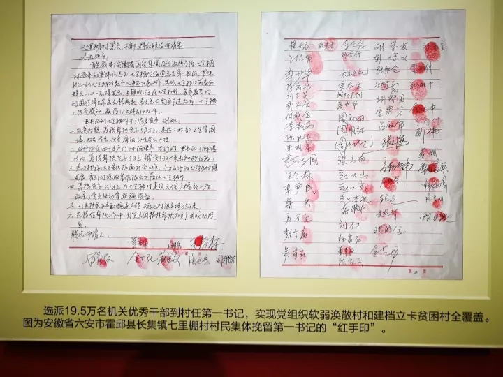 講解員:這幅照片,是安徽省六安市霍邱縣長集鎮(zhèn)七里棚村村民挽留第一書記的紅手印。七里棚村,村部到鎮(zhèn)街道僅7里路,因此得名。2014年時全村黨員共有101名,但是村兩委不融洽,黨員生活長期停擺,在群眾中沒有號召力,貧困戶253戶,共646人,有的窮的連下飯的咸菜都沒有。
