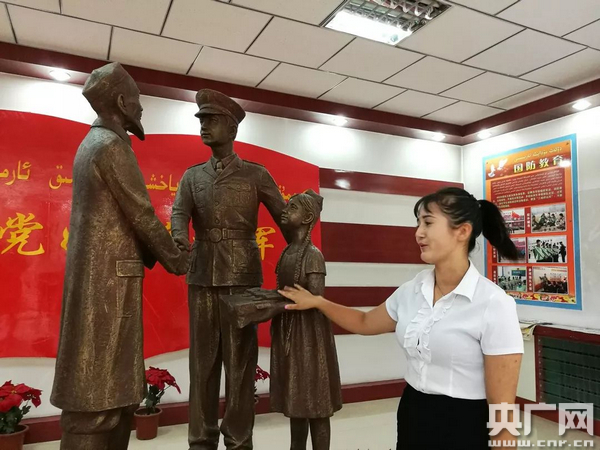 展覽室里正循環(huán)播放著當年學校奠基的時候的紀錄片,一個維族小姑娘代表同學們表達著對解放軍叔叔的感激之情。小姑娘名叫努爾比古麗·尼亞孜。如今,努爾比古麗·尼亞孜已經(jīng)從庫車師范學校畢業(yè),正在這里實習,她說她還要回到這里,接過解放軍叔叔的接力棒,繼續(xù)為阿格鄉(xiāng)和康村的發(fā)展奉獻自己的力量: