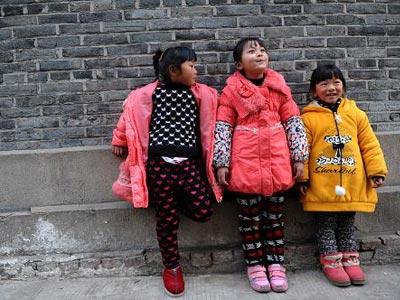 1月25日,6歲的陳鑫(中)在村莊路口與同伴玩耍。她的父母在浙江杭州打工,今年春節(jié),只有母親能夠回來和她團聚。