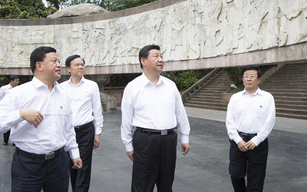 新華網(wǎng)北京6月16日電 據(jù)新華社客戶端報道,藍(lán)天白云,青松翠柏。習(xí)近平總書記16日離京來到貴州遵義考察,一下飛機就直奔紅軍山烈士陵園,向紅軍烈士紀(jì)念碑敬獻花籃。紀(jì)念碑四周的浮雕展現(xiàn)了當(dāng)年紅軍浴血奮戰(zhàn)的場景。在“突破烏江天險”浮雕前,總書記駐足感嘆:“當(dāng)時要是過不去就危險了……”碑上“紅軍烈士永垂不朽”8個字是鄧小平同志題寫的,他佇立凝望,聽取介紹。這是黨的十八大后習(xí)近平總書記第一次來黔考察。