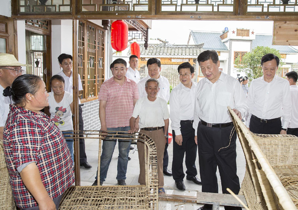 路旁田里,連片的向日葵花開得正艷,習(xí)近平下車駐足欣賞。當(dāng)?shù)馗刹扛嬖V總書記,伴隨美麗鄉(xiāng)村建設(shè),山花繁茂的花茂村成了婚紗拍照地,不少附近的市民結(jié)婚都到這來。沿著土墻和木欄相伴的鄉(xiāng)村小徑,習(xí)近平邊走邊詢問當(dāng)?shù)孛撠氈赂磺闆r?吹锦r花盛開,道路兩旁的房子干凈整潔,他有感而發(fā)地說:“怪不得大家都來,在這里找到鄉(xiāng)愁了!甭犝f水電路都解決了,他又關(guān)切地詢問衛(wèi)生情況?吹綆孜淮迕裾诼愤叿孔永锞幪僖,他走進去問:“編一個多長時間?”聽說一個三人座藤椅只要編4天,能賣1200塊錢,他說:“如果銷路好,那收入還挺高!