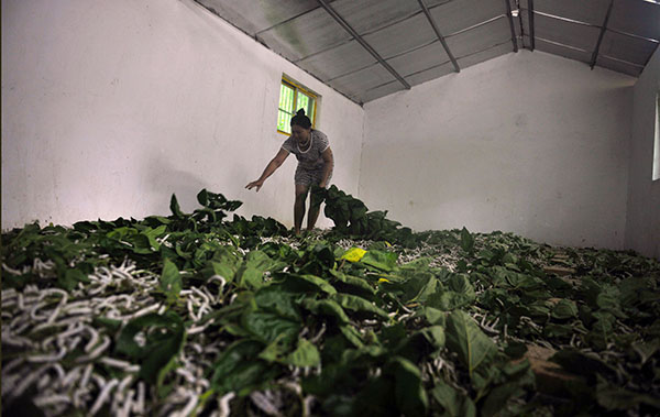 6月22日,瓊中縣灣嶺鎮(zhèn)竹朗村村民陳傳江的愛人符曉麗在給蠶喂桑葉。