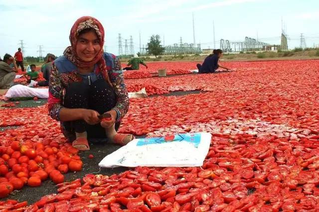 在新疆,因為光照時間長、晝夜溫差大,番茄的紅色素和含糖量都居全國之首。目前,新疆已是世界第三大番茄生產基地,占全國總產量的80%。這里的番茄被加工成各種各樣的番茄制品,出口到中亞、歐洲,甚至美洲等地,在市場上已經相當有“明星相”。